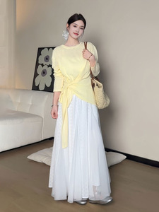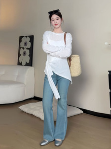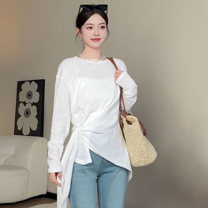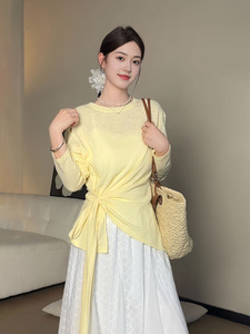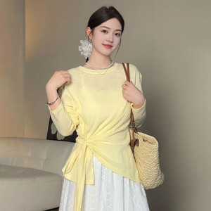 大码女装胖mm宽松慵懒风秋季薄款防晒罩衫上衣设计感绑带显瘦T恤