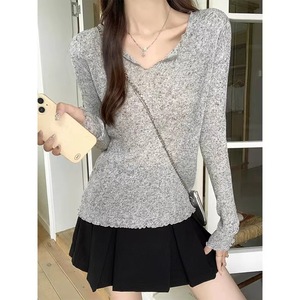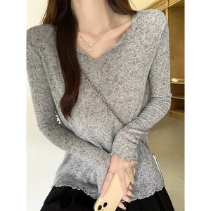 灰色v领木耳边长袖t恤女秋季设计感小众修身内搭打底衫纯欲上衣潮