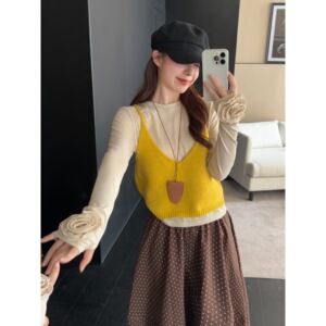 实拍~2025秋季新款韩系减龄针织吊带玫瑰长袖T恤波点半裙三件套女