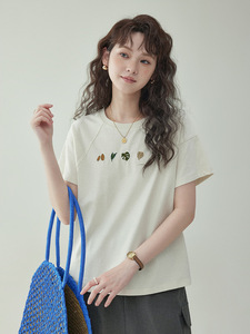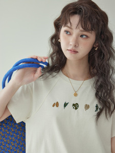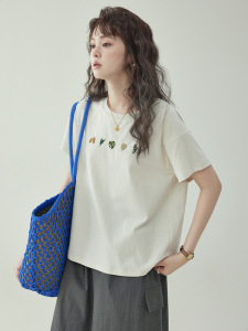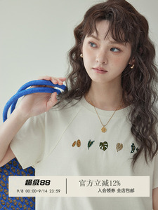 「北岛AMUU原创」简约纯色圆领叶子刺绣t恤女夏新款套头短袖上衣