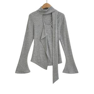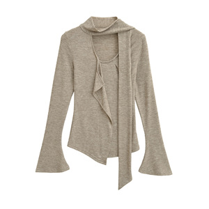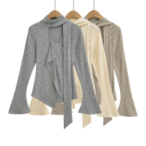 荷叶边飘带镂空长袖T恤女2025秋季新款设计感不规则修身打底上衣