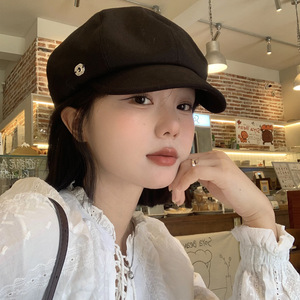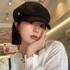日系复古黑色云朵贝雷帽女春秋新款百搭大头围显脸小八角画家帽子