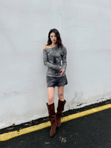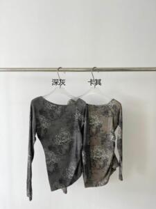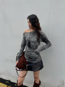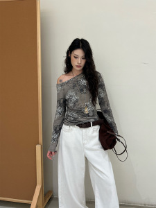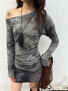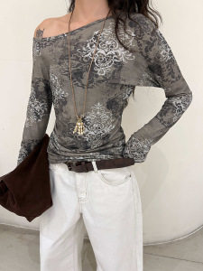 2025秋季新款复古抽褶收腰复古印花斜领一字肩上衣长袖T恤85258
