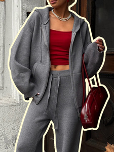 跨境热卖针织连帽套装女灰色拉链连帽外套宽松显瘦阔腿裤慵懒时髦