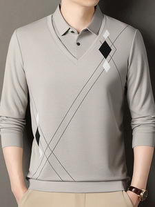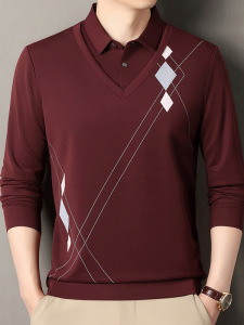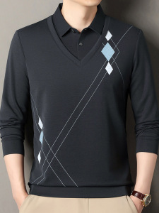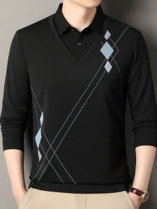 2025新款假两件长袖POLO衫秋冬季男士卫衣条纹宽松亲肤休闲打底衫
