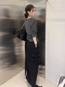 灰色v领长袖t恤女士2025春秋新款设计感排扣褶皱收腰显瘦正肩上衣