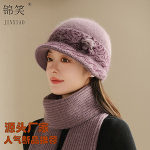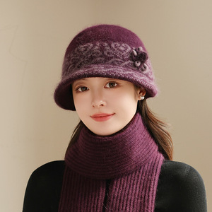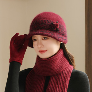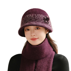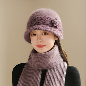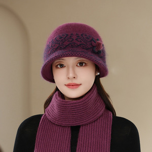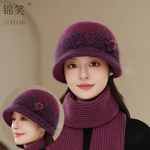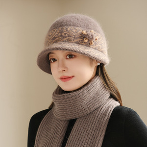 时尚提花中老年人帽子女冬季兔毛针织花朵盆帽加绒保暖护耳妈妈帽