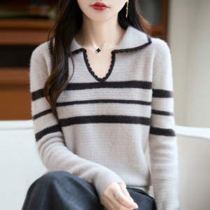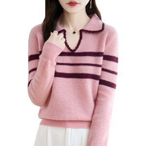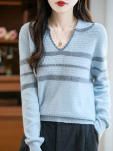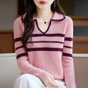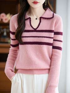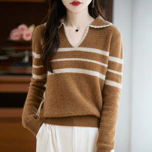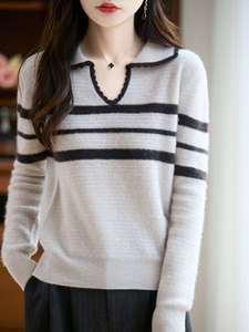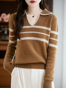 女式半开领POLO衫100纯羊毛内搭打底秋冬新款蜂窝拼色提花套头衫