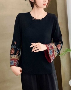 2025秋季新款翻领套头盘扣拼接宽松版民族风刺绣长袖新中式打底衫