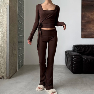 2025年冬季欧美风纯色针织绑带V领睡衣长袖长裤两件套女式家居服