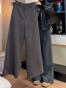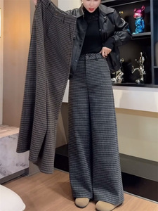 韩系格纹毛呢休闲裤2025年女大码秋季厚款梨形高腰显瘦宽松阔腿裤