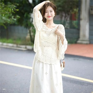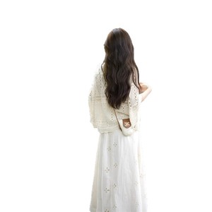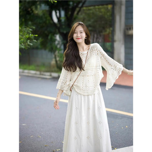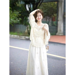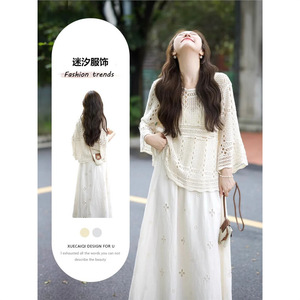 秋季搭配一整套法式慵懒钩花针织罩衫白色提花a字半身裙两件套女
