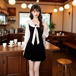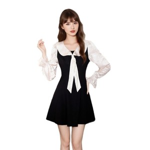 黑色假两件拼接波点连衣裙女2025秋冬新款独特漂亮法式收腰裙子