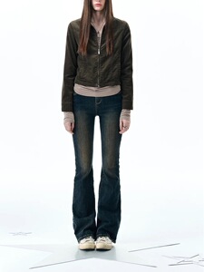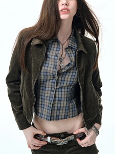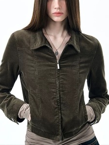 细灯芯绒夹克复古做旧翻领上衣秋季慵懒风辣妹收腰短外套女