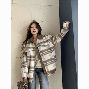 小香风复古格子西装毛呢外套女款春秋款夹克灯芯绒拼接宽松BF上衣