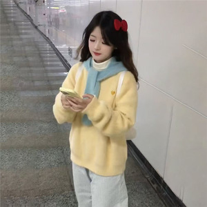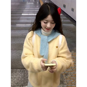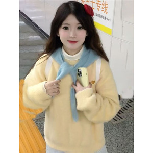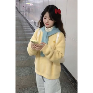 温柔甜美秋冬黄色圆领毛衣小个子学生秋冬新款宽松针织衫慵懒上衣