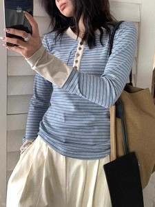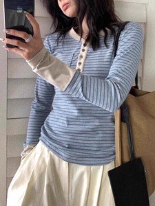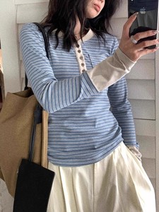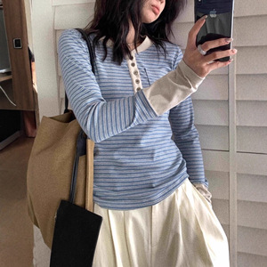 复古蓝色条纹半开领正肩长袖t恤女早秋小个子单穿内搭打底衫上衣