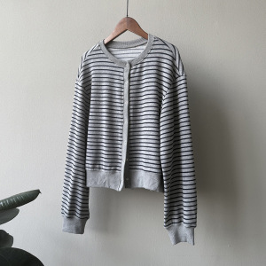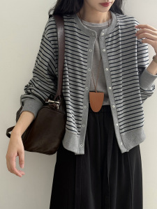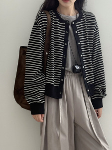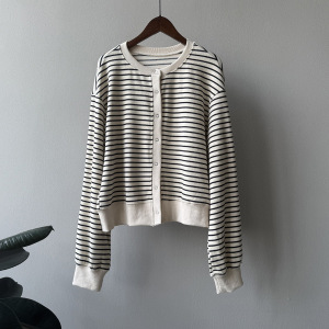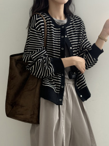 言双 简约圆领小按扣条纹针织开衫女 秋季宽松显瘦开衫上衣20199