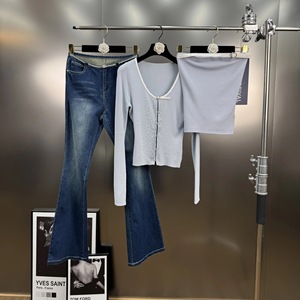 2025年早秋新款时尚设计感冰丝针织抹胸搭配钻开衫微喇裤三件套