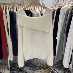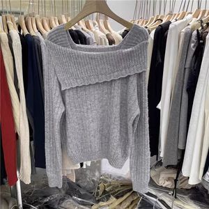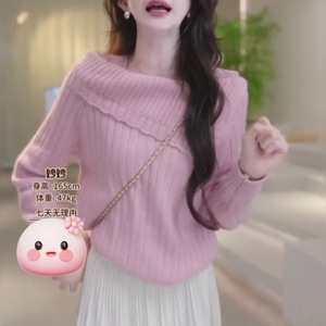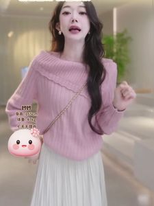 法式一字肩翻领毛衣女秋冬外穿宽松慵懒风韩系穿搭针织衫上衣