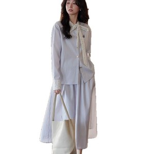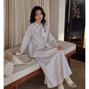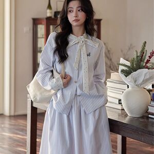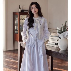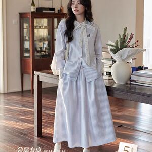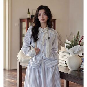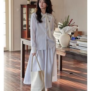 2025新款春秋韩系学院风气质时尚小众蓝色条纹衬衫半身裙套装女