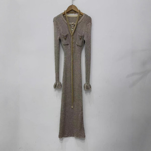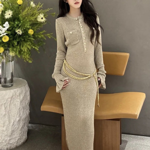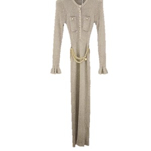 法式小众2025秋季新款千金风卡其色链条收腰长款针织连衣裙女