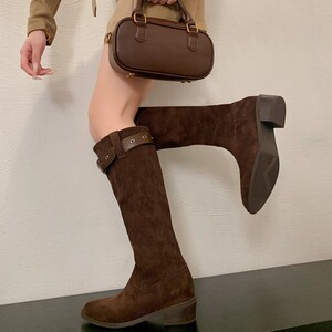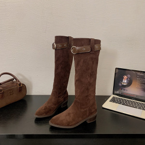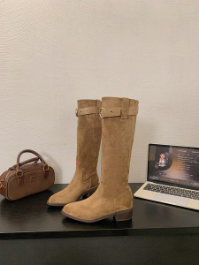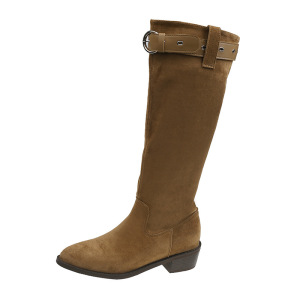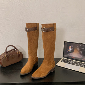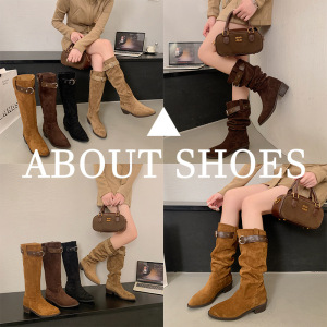 8618褶皱堆堆靴子女牛仔靴尖头粗跟显瘦不过膝长靴辣妹风骑士靴女