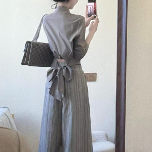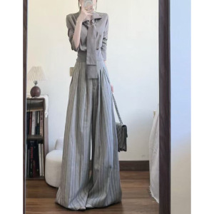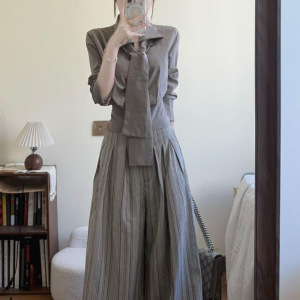 韩系早秋通勤职业穿搭一整套慵懒感长袖衬衫条纹阔腿裤两件套装女