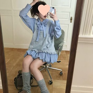 韩系复古格子蝴蝶结系带衬衫裙显瘦花苞裙女背心甜美套装秋季纽扣
