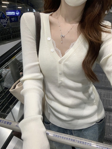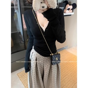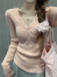 网红甜辣风深V纯欲针织衫上衣女秋季纽扣半开领紧身毛衣打底内搭