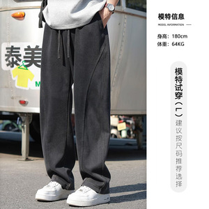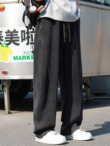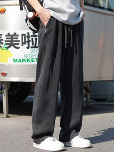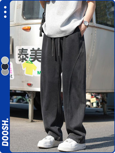 男生休闲裤慵懒重磅卫裤男直筒男裤抽绳阔腿弯刀裤宽松水洗运动裤