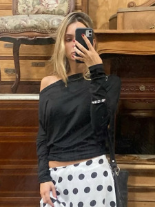 2025秋季纯色斜领漏肩蝙蝠袖长袖设计感时尚宽松套头休闲T恤女
