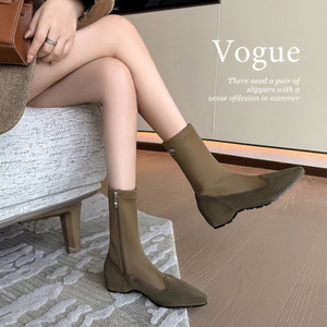 女士拼接时尚2025年新款尖头中跟内增高短筒短靴子优雅时装靴