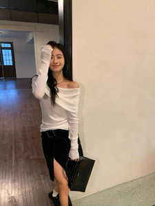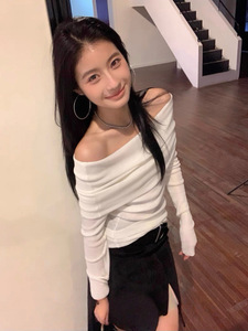 50%羊毛 25aw荡领一字肩两穿毛衣女秋季法式修身露肩斜肩针织上衣