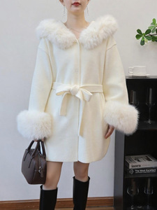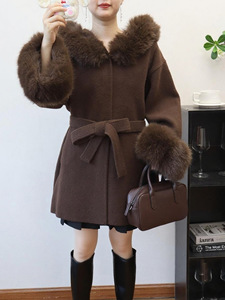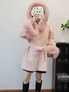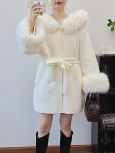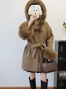 连帽拼接毛毛高级感针织双面呢大衣外套2025秋冬新款毛衣开衫女潮