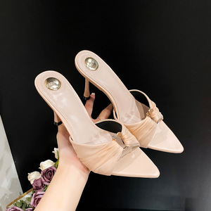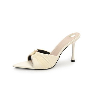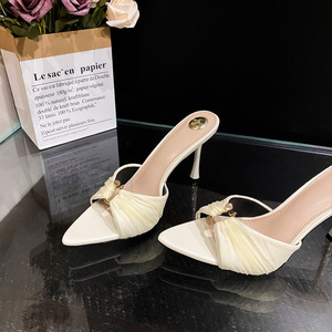 L-67工厂定制换标杨树林2025新款尖头外穿凉拖鞋感褶皱细跟凉鞋女