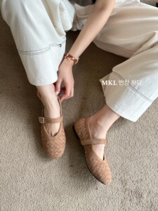 韩版圆头头一字扣浅口单鞋平底编织瓢鞋休闲时尚芭蕾舞鞋女鞋