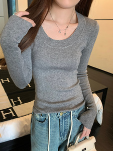 法式气质U领长袖针织衫女秋季修身显瘦内搭打底衫百搭ins套头上衣