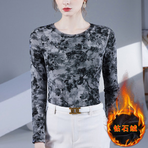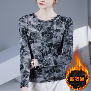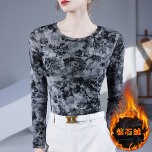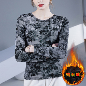 圆领网纱加绒打底衫女土秋冬洋气印花加厚保暖小衫长袖网纱上衣
