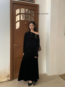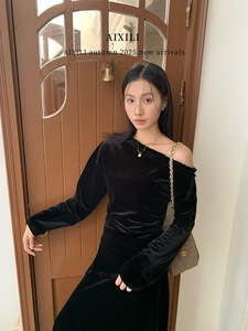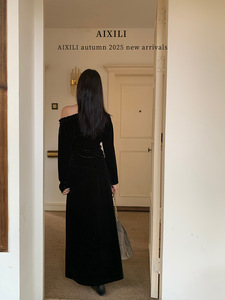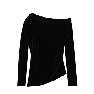 爱西里2025秋气质拼接木耳花边设计斜肩不规则下摆丝绒上衣15505