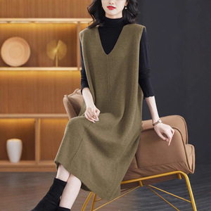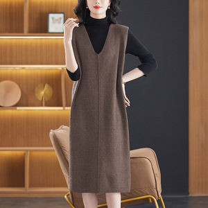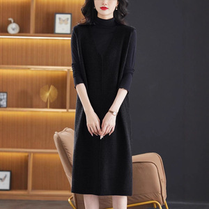 鸡心领针织连衣裙女春秋冬新款气质显瘦毛衣裙长款过膝马甲背心裙