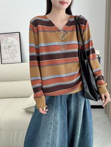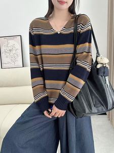 2025秋季新款针织衫短款V领气质打底衫拼接撞色条纹复古毛衣女