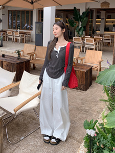 黑白条纹拼接撞色半开领长袖T恤女2025年初秋新款褶皱设计感上衣