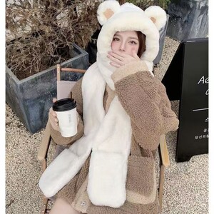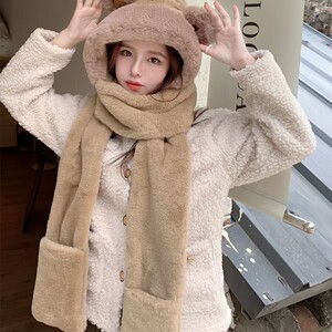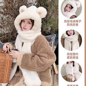 冬季小熊帽子围巾手套一体女韩版保暖毛绒三件套可爱连帽护耳女