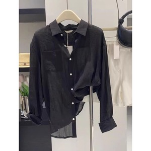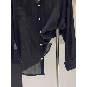 实价现货法式黑色天丝防晒衬衫女夏季亚麻薄款衬衣宽松慵懒上衣夏