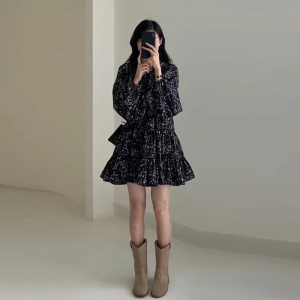 黑色碎花裙【气质雪纺碎花沙滩裙穿搭/开工穿搭/浮夸裙子/春季穿搭/清纯掐腰裙/社会连衣裙/春款女装/