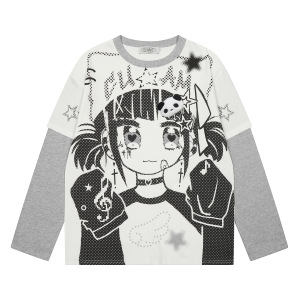 Fudge Pink 25秋季New甜美少女卡通图案假两件宽松长袖T恤