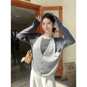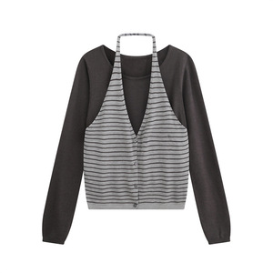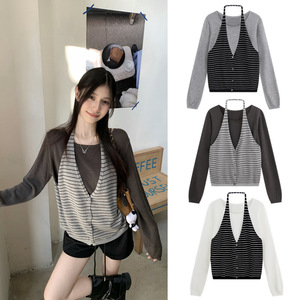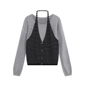 实拍 纯欲风辣妹条纹挂脖针织衫女秋季设计感假两件长袖上衣88736