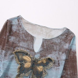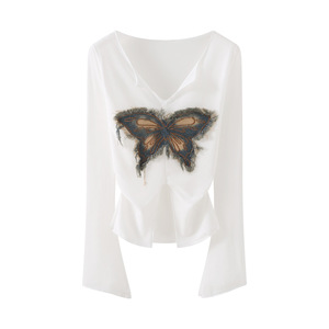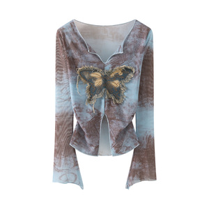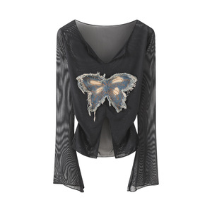 2025秋季新款美式辣妹蝴蝶印花网纱长袖上衣女修身显瘦打底衫