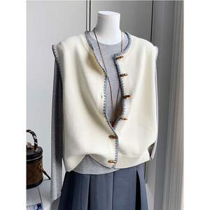 女士文艺纯色开衫马甲2025春秋新款宽松背心圆领牛角木扣针织马夹